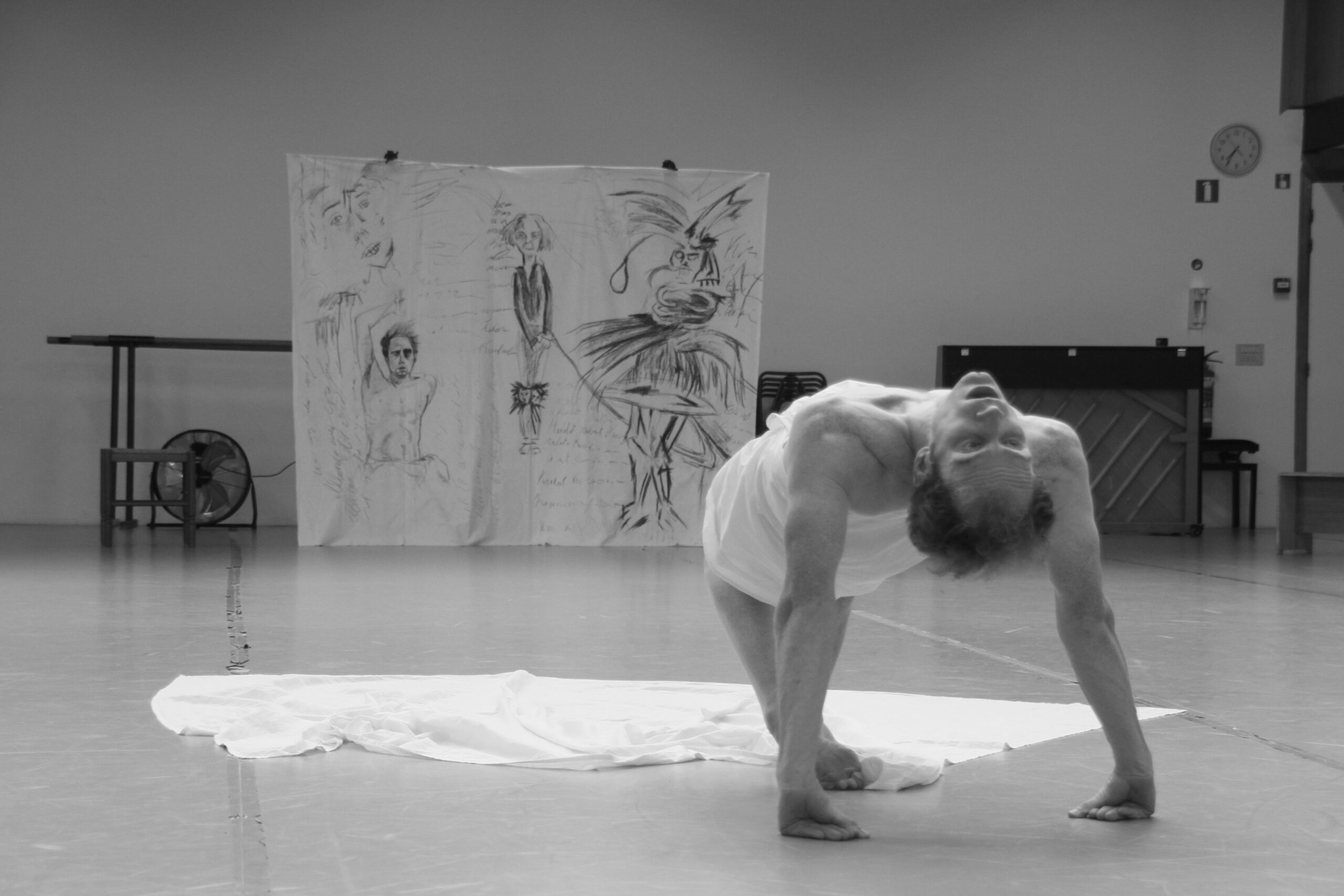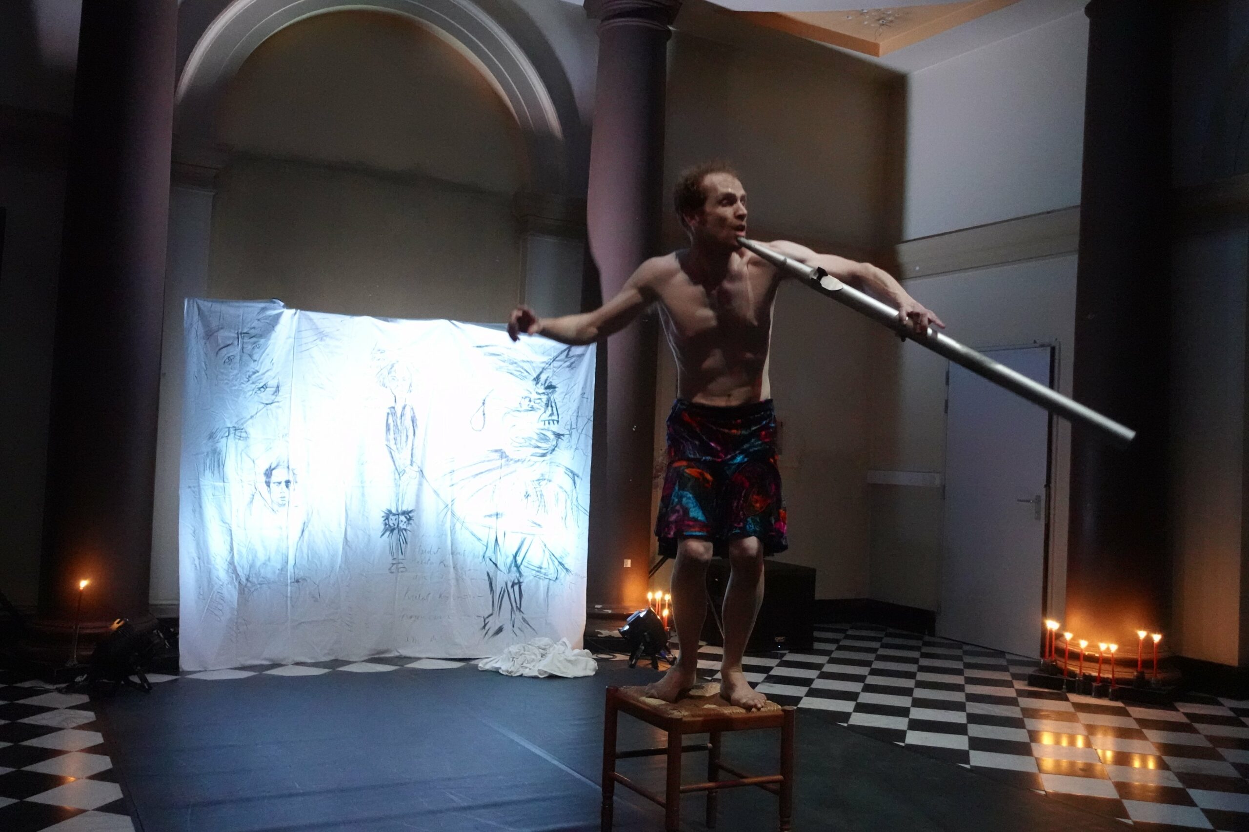 Distribution / D’après Antonin Artaud / Chorégraphie et dramaturgie : Julie Hahn / Performeur : Christophe Jaccard / Création lumière et régie : Artur Canillas / Dessin : Colin Vanandruel / Graphisme : Jean-François Hocq / Avec le soutien de Grand Hospice